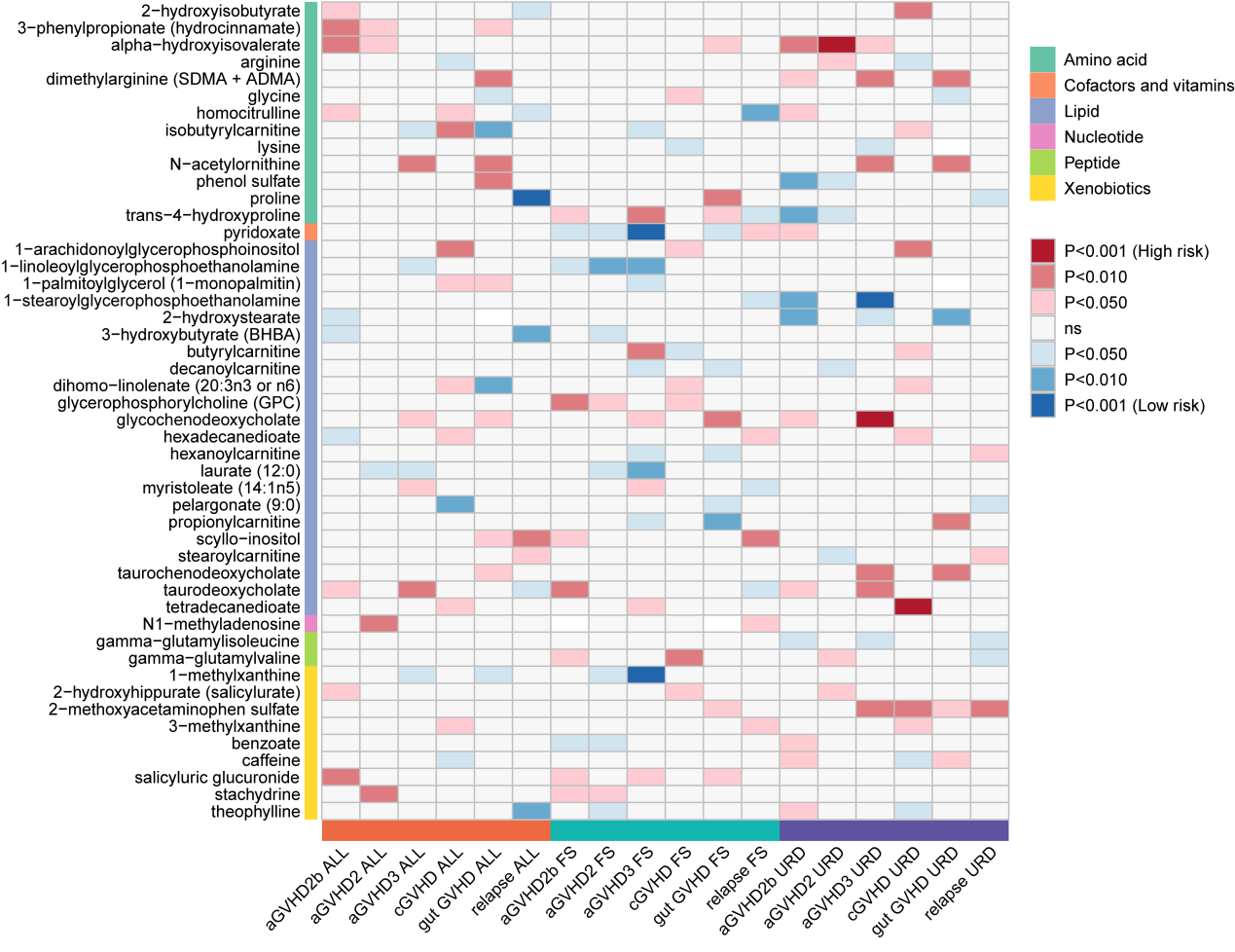 本研究借助孟德尔随机化(MR)等遗传流行病学方法,利用人群基因变异天然“随机化”的特性,从源头上厘清代谢物与GVHD之间的因果关系。基于大规模血液代谢组和免疫细胞全基因组关联(GWAS)概述统计量,综合运用多种遗传统计学方法,系统评估了309种血液代谢物与allo-HSCT相关结局的因果关系,初步筛选出188个与GVHD及复发显著相关的候选代谢物。在多重校正后,最终确定了4个具有稳定因果效应的关键代谢物:吡哆酸盐在同胞供者中可显著降低3-4级急性GVHD(aGVHD3)风险;甘氨胆酸在无关供者中与aGVHD3风险增加相关;1-硬脂酰甘油磷酸乙醇胺则表现出对aGVHD的保护作用;脯氨酸可降低复发风险。研究通过多变量MR、敏感性分析与独立队列验证,确认了这些代谢物的独立性和稳健性。此外,粪便代谢组和前瞻性队列分析发现,aGVHD患者的吡哆醇水平显著低于未发生GVHD组,进一步支持其生物学相关性。