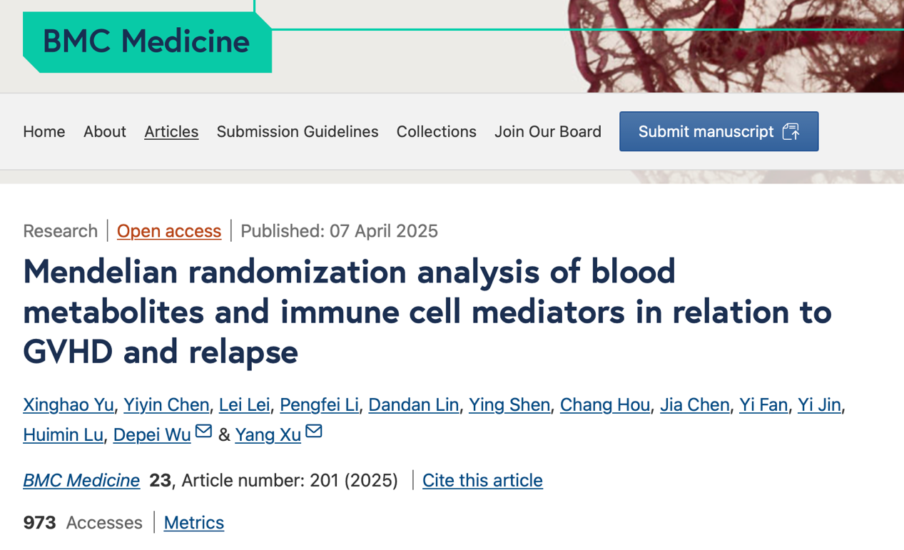 2025年4月,国家血液系统疾病临床医学研究中心、苏州大学附属第一医院、苏州大学造血干细胞移植研究所的吴德沛教授和徐杨教授团队在BMC Medicine杂志(IF=7.0)在线发表了题为“Mendelian Randomization Analysis of Blood Metabolites and Immune Cell Mediators in Relation to GVHD and Relapse”的文章,首次系统性地揭示了代谢物在造血干细胞移植后移植物抗宿主病(GVHD)与复发中的因果作用机制。