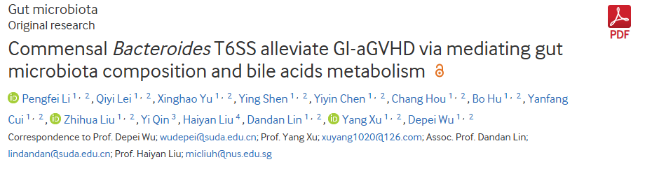 2025年5月,国家血液系统疾病临床医学研究中心、苏州大学附属第一医院、苏州大学造血干细胞移植研究所的吴德沛教授和徐杨教授团队在GUT杂志(IF=23.1)在线发表了题为“Commensal Bacteroides T6SS alleviate GI-aGVHD via mediating gut microbiota composition and bile acids metabolism”的文章,首次系统性揭示了肠道共生菌利用六型蛋白分泌系统调节肠道稳态,减轻造血干细胞移植后急性移植物抗宿主病的作用机制。