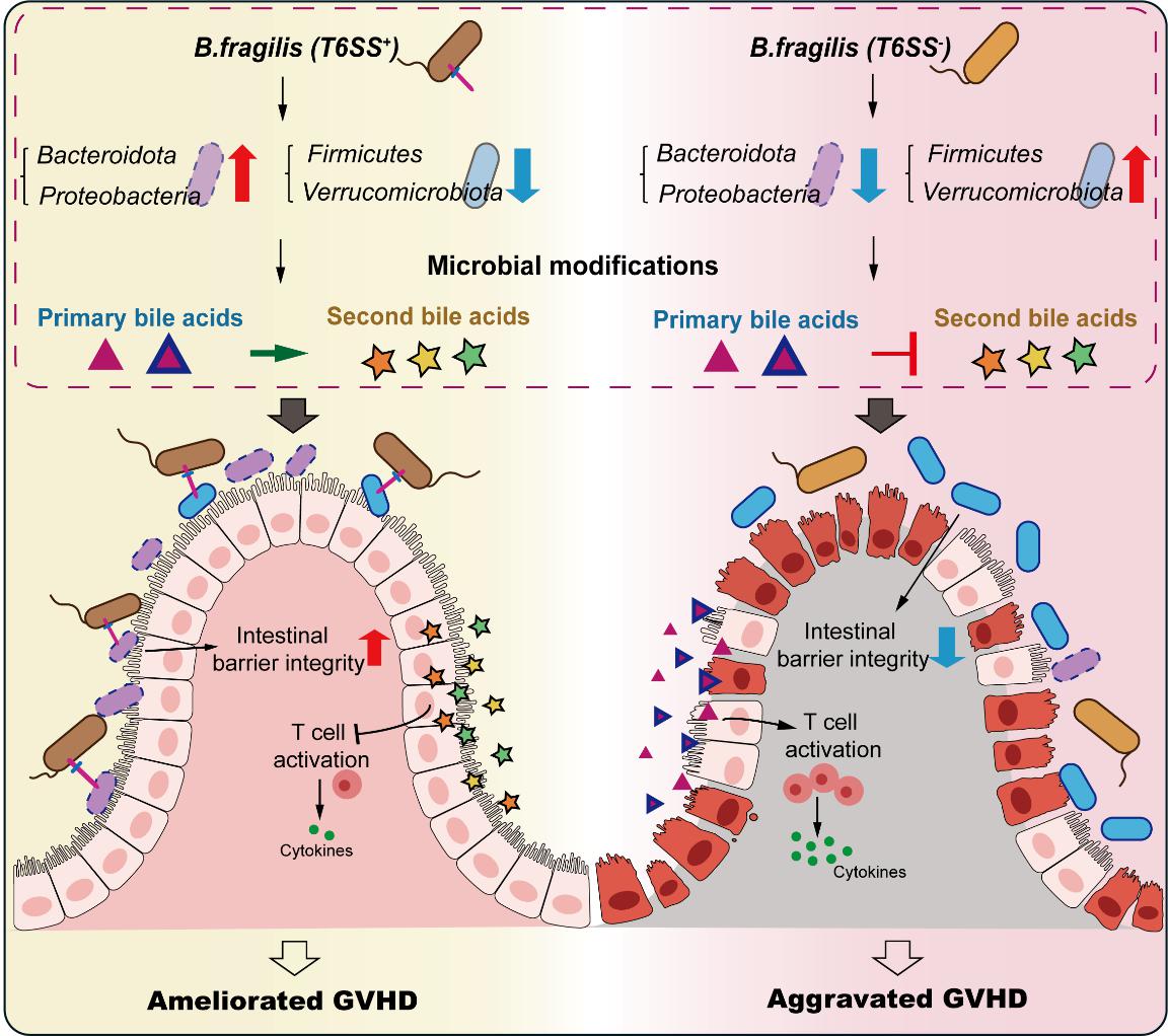 Design We profiled the gut microbiota, immune indices, and gut metabolism of 71 patients undergoing allo-HSCT. Initially, we set up mouse aGVHD model to confirm the effect ofB. fragilis T6SS on aGVHD progression. Subsequently, we applied 16S ASV sequencing and metabolic sequencing to reveal the function ofB. fragilis T6SS on microbial structure intestinal and metabolome. Finally, the mediation package was used to validate our findings in clinical samples.