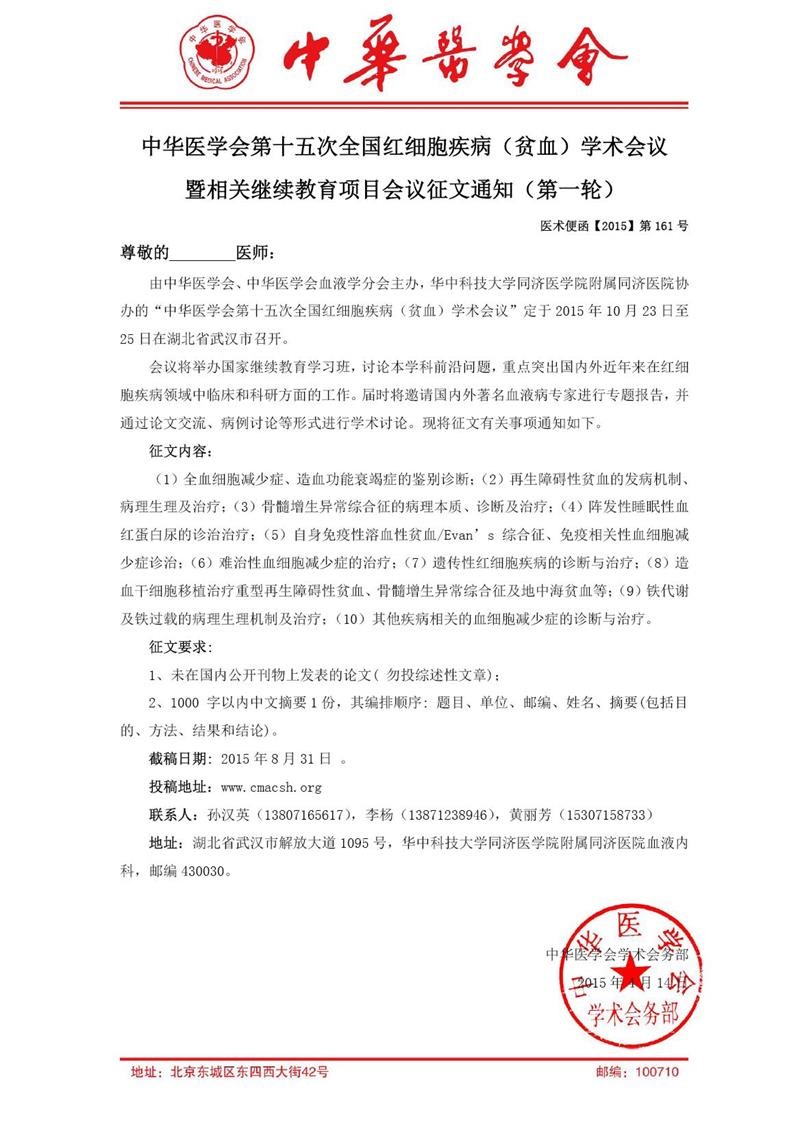 中华医学会第十五次全国红细胞疾病(贫血)学术会议暨相关继续教育项目会议征文(截止2015.8.31)