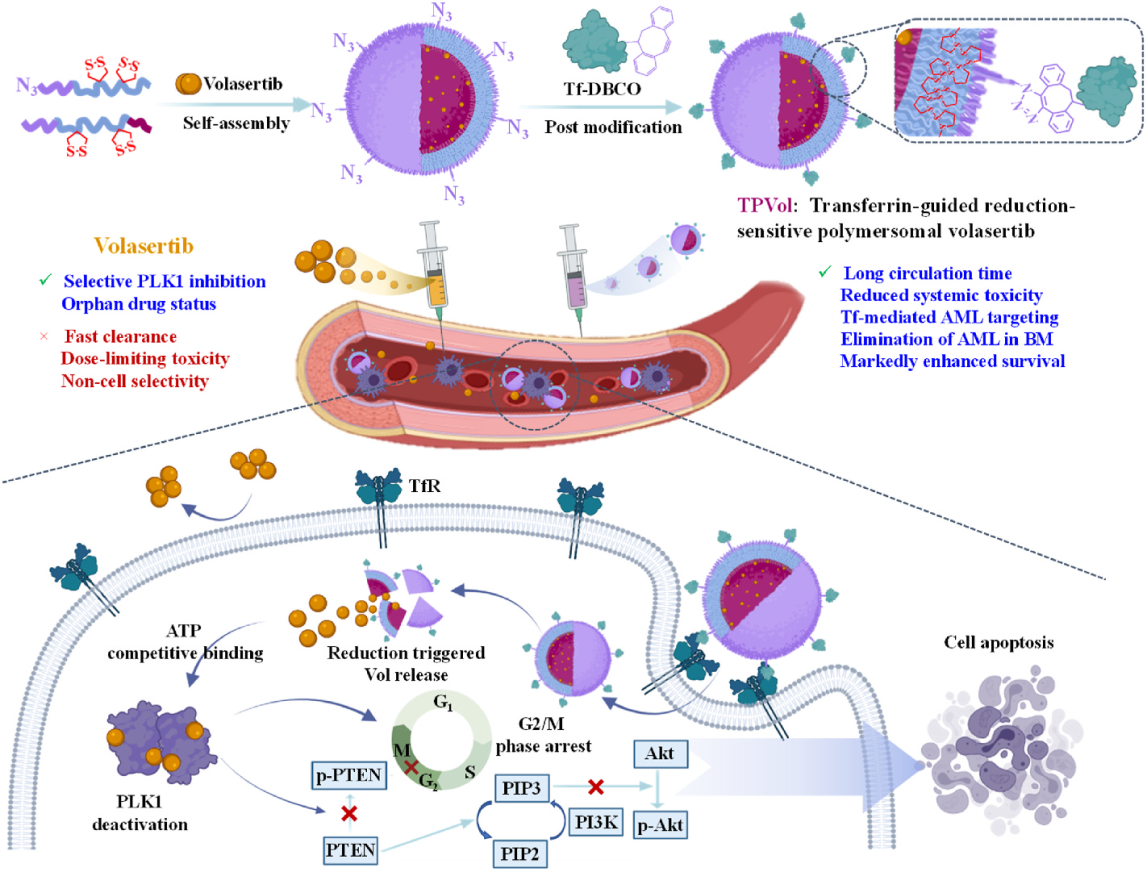 AML是最致命的恶性肿瘤之一。课题组前期通过大样本AML临床样本分析显示,60%的AML 患者过表达polo 样激酶1(PLK1),多种PLK1抑制剂如 volasertib (Vol)和onvansertib已用于AML患者的治疗。然而,由于Vol生物利用度低并且所需剂量较高,伴随着明显的剂量限制毒性,极大地限制了其临床效益。纳米药物的靶向给药为提高分子药物的疗效提供了潜在的策略。包括AML 在内的许多癌症都高表达转铁蛋白受体,促进了各种转铁蛋白介导的纳米系统的发展。与抗体和抗体片段不同,转铁蛋白作为内源性蛋白不具有免疫原性。