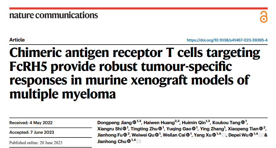 2023年6月,国家血液系统疾病临床医学研究中心、苏州大学附属第一医院、造血干细胞移植研究所的吴德沛、徐杨、储剑虹教授课题组在Nature Communications期刊上在线发表了题为“Chimeric antigen receptor T cells targeting FcRH5 provide robust tumour-specific responses in murine xenograft models of multiple myeloma”的研究论文,报道了靶向FcRH5的CAR-T细胞在体外和小鼠异种移植模型中具有强力的清除多发性骨髓瘤(MM)细胞的能力,揭示FcRH5可作为CAR-T疗法治疗复发难治性MM的全新靶点。
