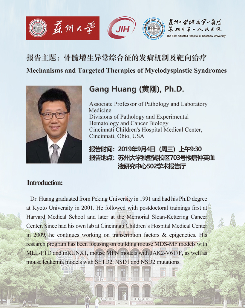 有关2019年9月4日骨髓增生异常综合征的发病机制及靶向治疗学术讲座通知