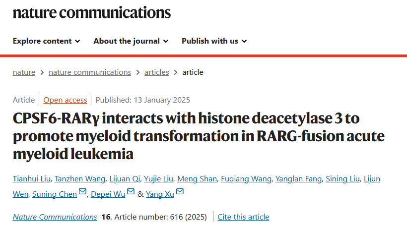 2025年1月,国家血液系统疾病临床医学研究中心、苏州大学附属第一医院及苏州大学造血干细胞移植研究所的徐杨教授团队与中国医学科学院李珂教授团队在《Nature Communications》(IF=14.7)杂志上背靠背发表了题为“CPSF6-RARγ interacts with histone deacetylase 3 to promote myeloid transformation in RARG-fusion acute myeloid leukemia”的研究论文。该研究揭示了RARG融合蛋白与HDAC3协同作用导致髓系恶性肿瘤转化的分子机制,并在临床前模型中证明HDAC抑制剂能够选择性改善RARG-AML的治疗效果。本研究结果为RARG-AML患者提供了极具潜力的新治疗策略。
